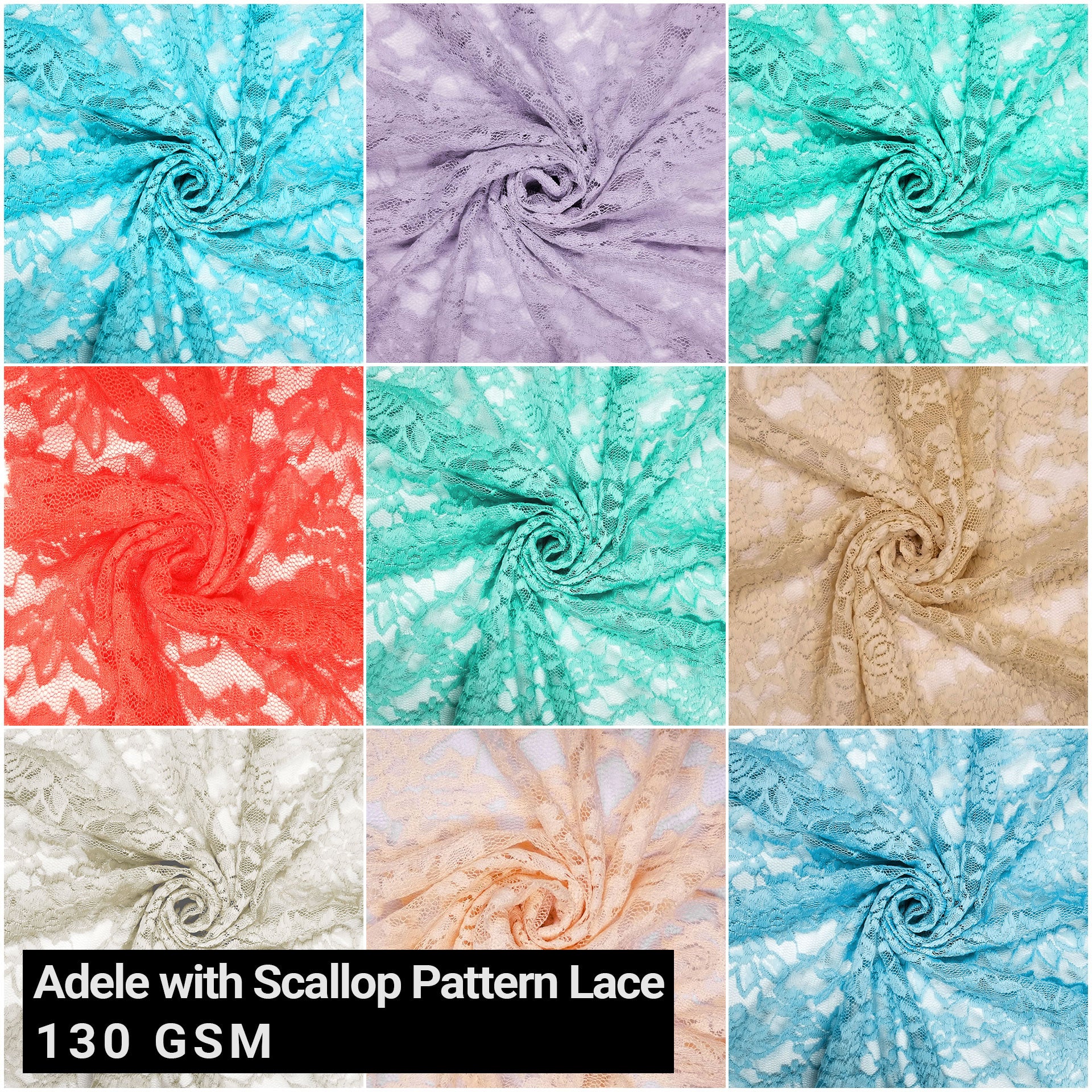 Expertly crafted from a blend of cotton and nylon, this 58" high-quality lace fabric features an Adele with scallop pattern that adds a touch of elegance to any project. With a weight of 130gsm, it offers both durability and a delicate feel. Perfect for creating stylish and sophisticated designs. It's perfect for wedding dresses, bridal dresses, shorts, skirts, dresses, and handmade DIY crafts.