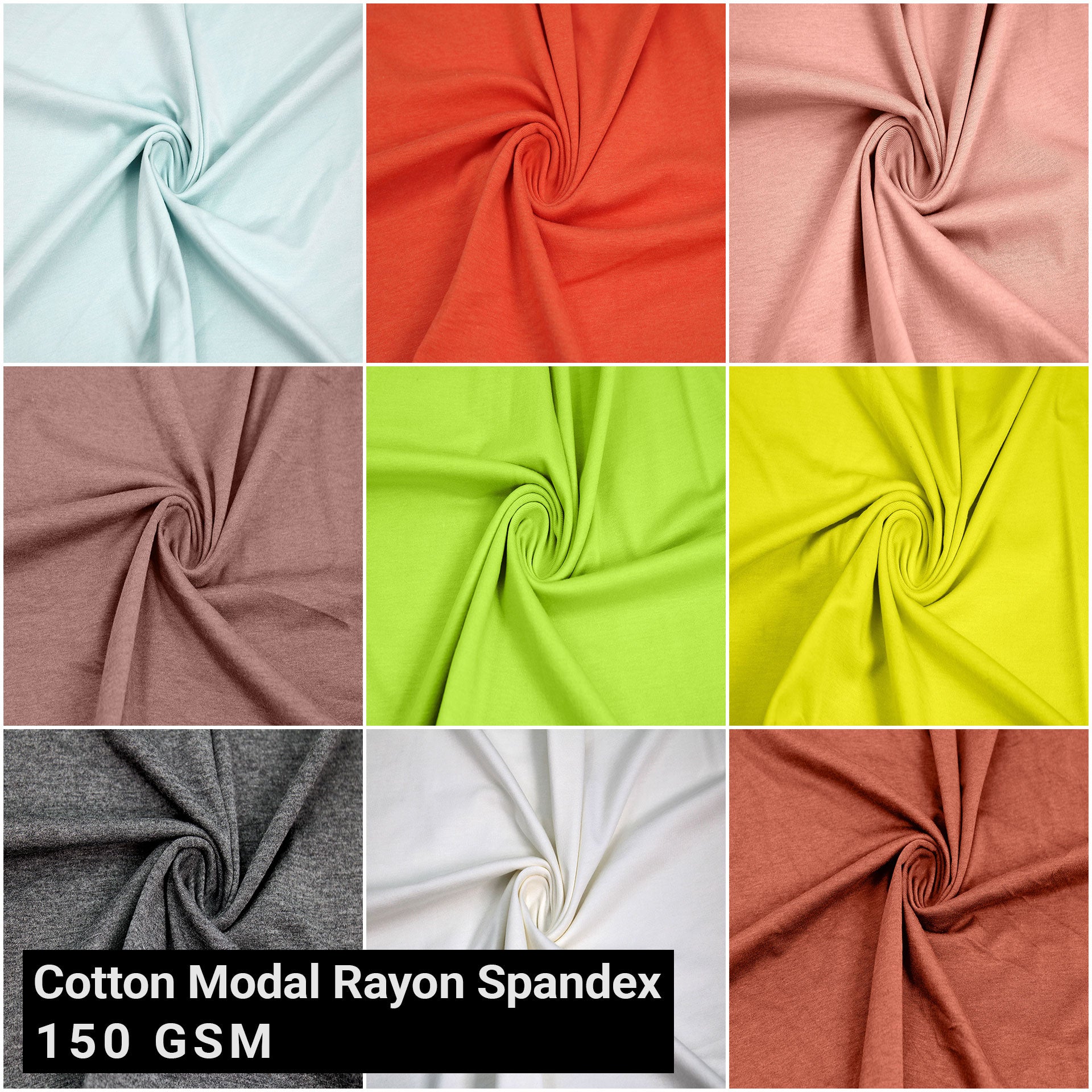- This cotton modal rayon spandex fabric contains 48% cotton, 48% rayon, and 4% spandex. This combination creates a fabric that is soft, breathable, has a good drape, and offers stretch for added comfort and flexibility.